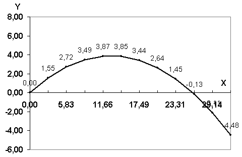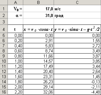 введем формулы: =$B$1*COS(РАДИАНЫ($B$2))*A5 =$B$1*SIN(РАДИАНЫ($B$2))*A5-4,9*A5*A5 |